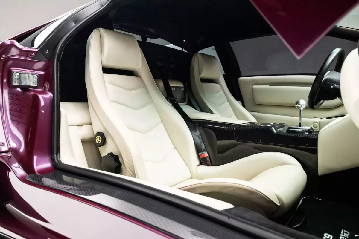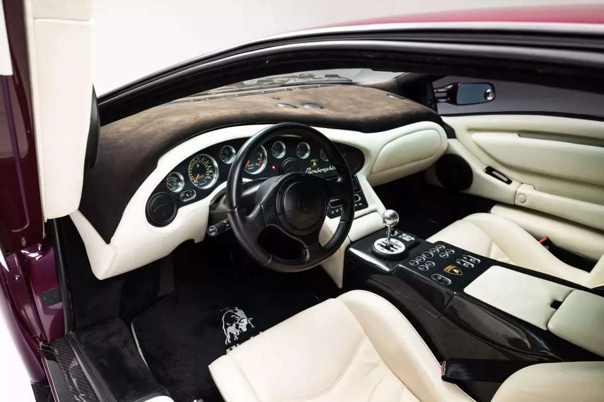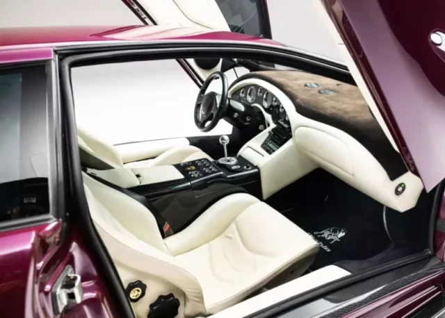 Pero lo que eleva a este ejemplar a la categoría de joya única es su pintura Viola Ophelia, un púrpura profundo y metálico. Este color, extremadamente raro en la gama Lamborghini de la época, genera un efecto visual hipnótico bajo el sol, con matices que cambian de violeta intenso a negro azabache según la luz.