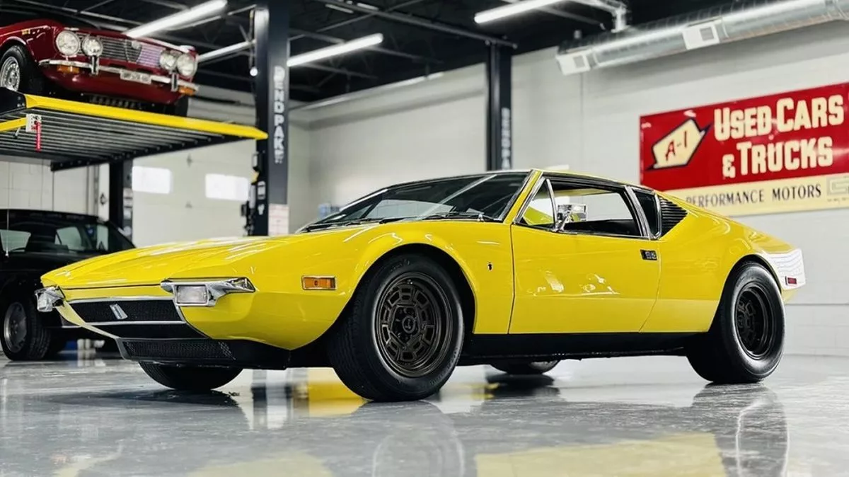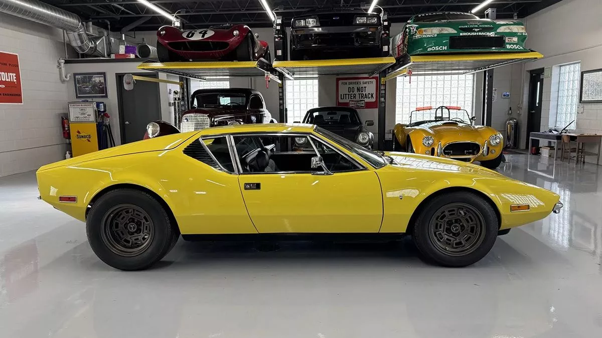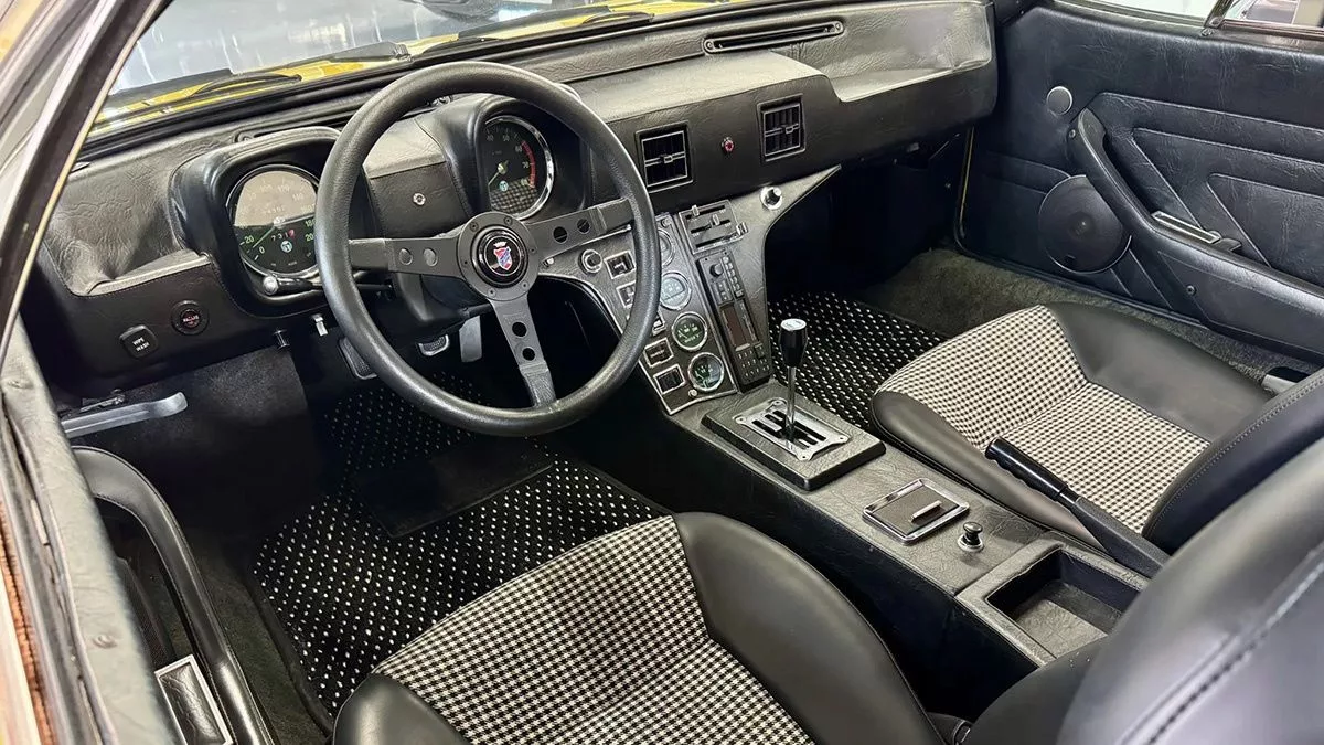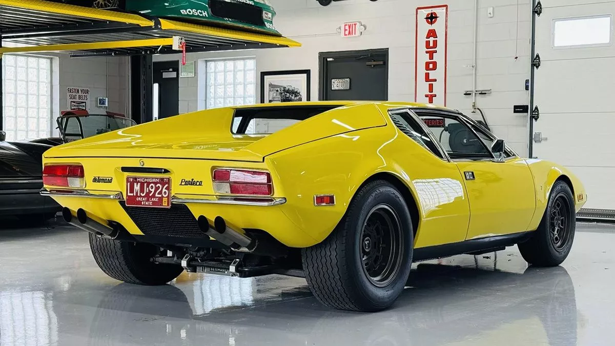 El Pantera del CEO de Ford luce una vibrante capa de pintura amarilla, que contrasta con los detalles cromados y un juego de llantas de magnesio Campagnolo de 15 pulgadas en color bronce. En el interior, los asientos de vinilo negro presentan inserciones de tela con patrón de pata de gallo, un detalle de gran estilo clásico.